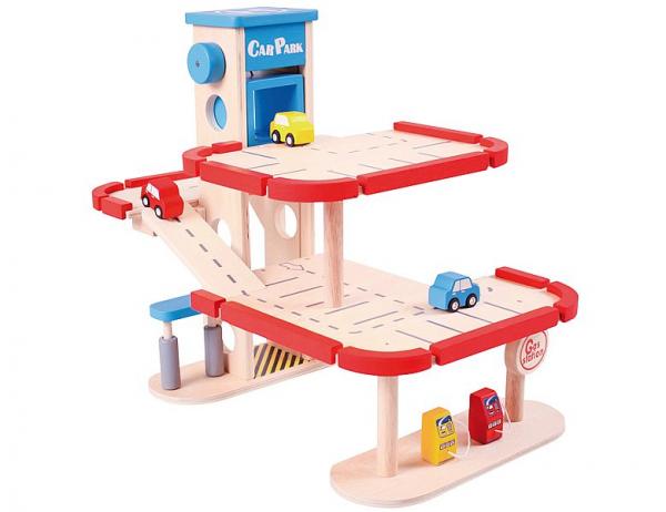 Stabiles Parkhaus aus Holz inklusive 3 Autos zum Spielen. Die Fahrzeuge können auf 2 Etagen fahren und durch einen Lift in die verschiedenen Stockwerke transportiert werden. Im Erdgeschoss befindet sich die Tankstelle mit 2 Säulen.